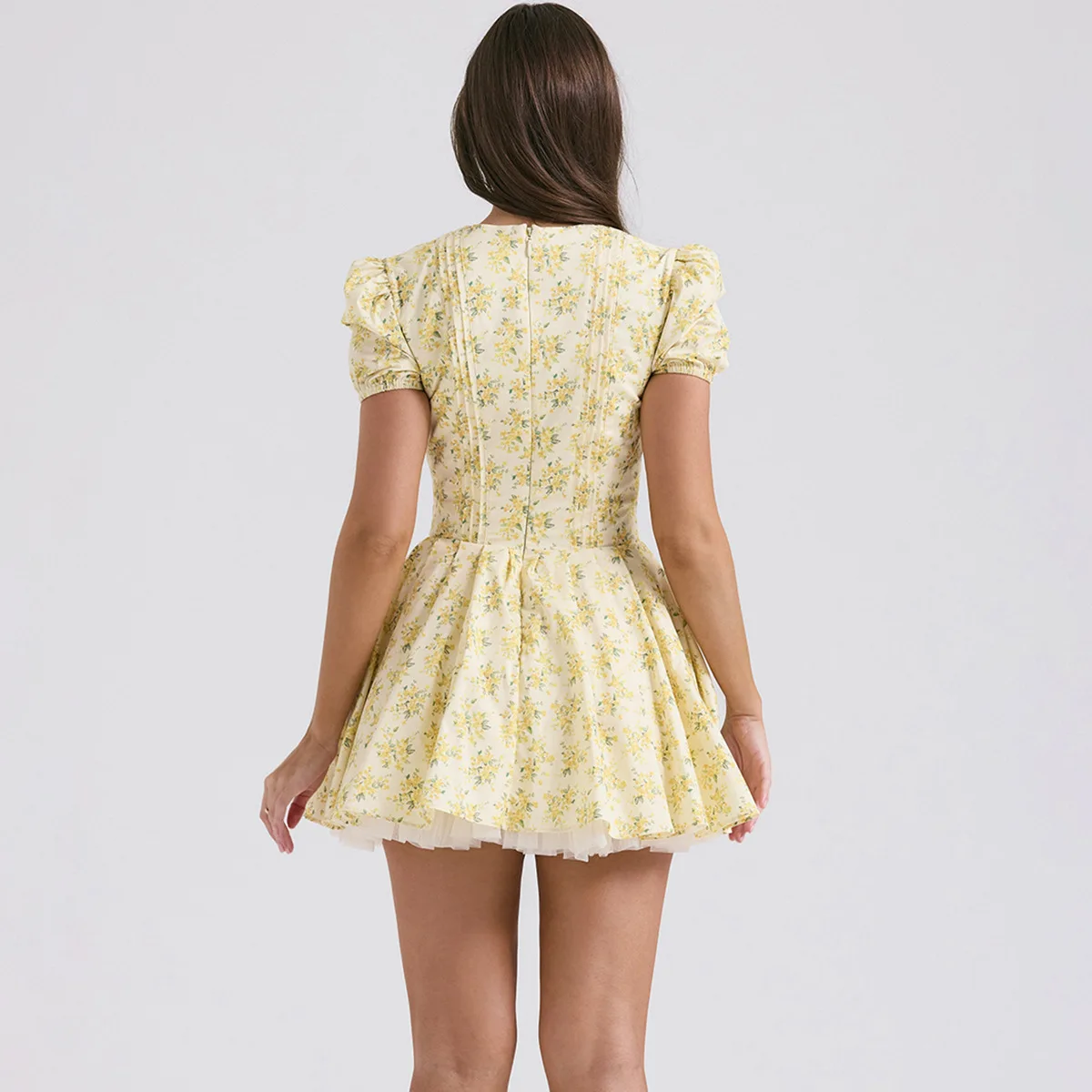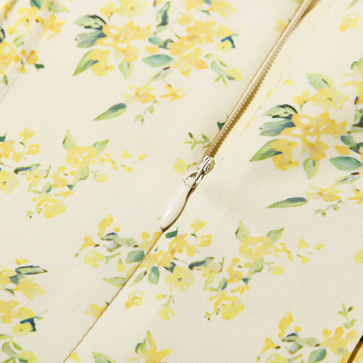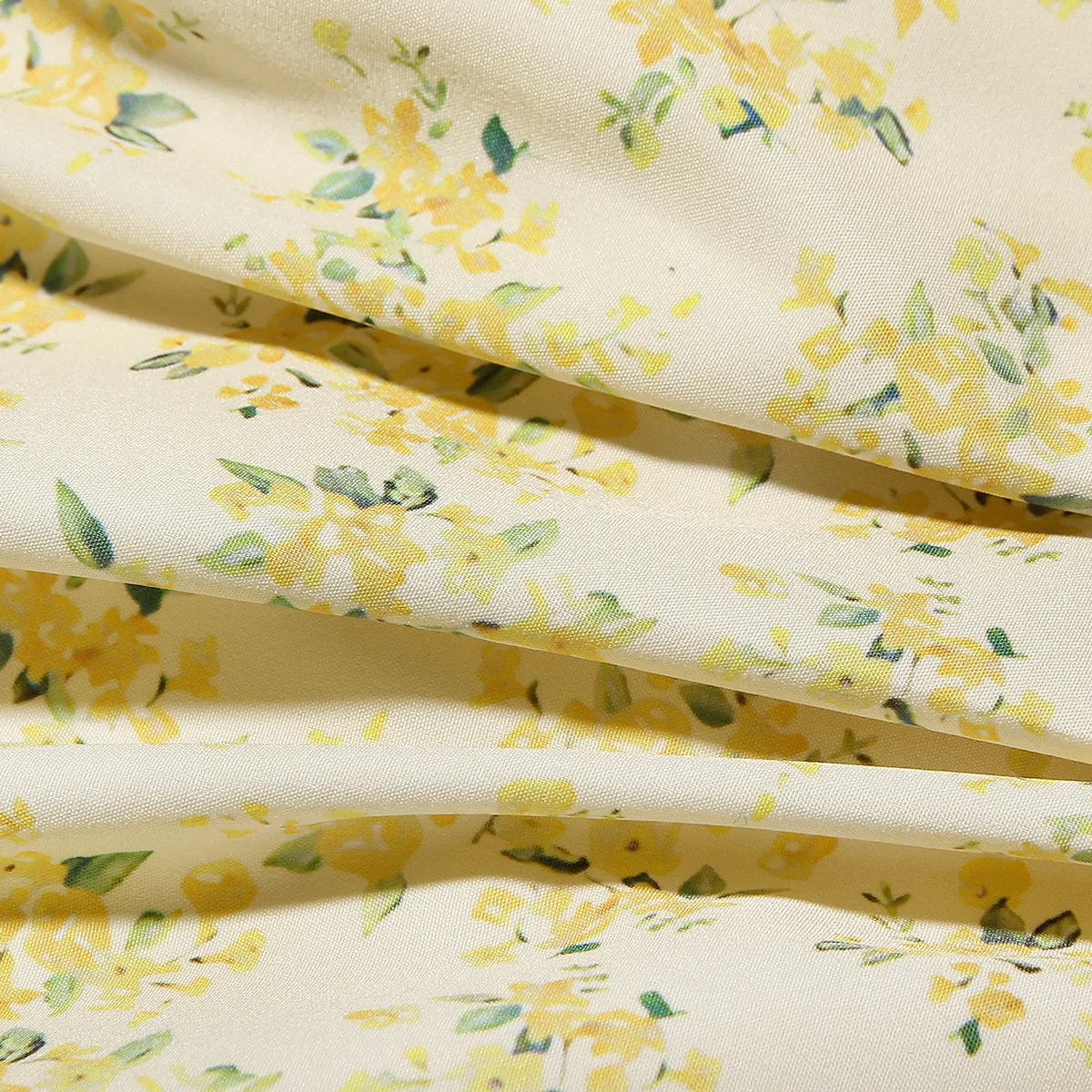 Originating from Guangdong, China, the Suninheart dress represents a blend of traditional craftsmanship and contemporary fashion trends. Its preppy style is highlighted by the elegant floral patterns, ruffled details, and slight stretch fabric that ensures durability and comfort.